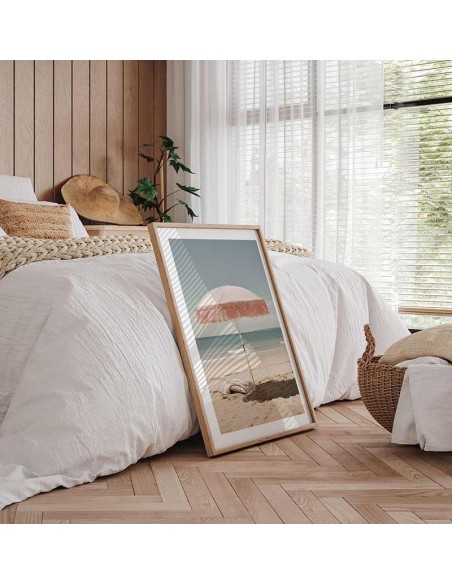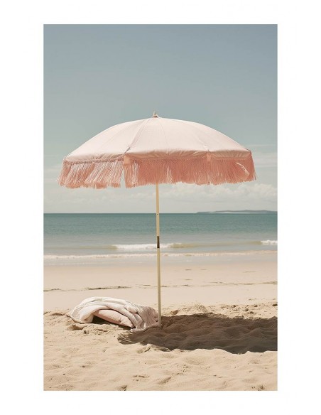 Sombrilla blanca con flecos rosas en primer plano de la imagen con mar azul en el fondo. La luz propia de un día soledad que realza la sombre generada por la sombrilla aporta calidez y serenidad a la imagen. Una imagen disponible en varios tamaños ideal para ambientes de playa.