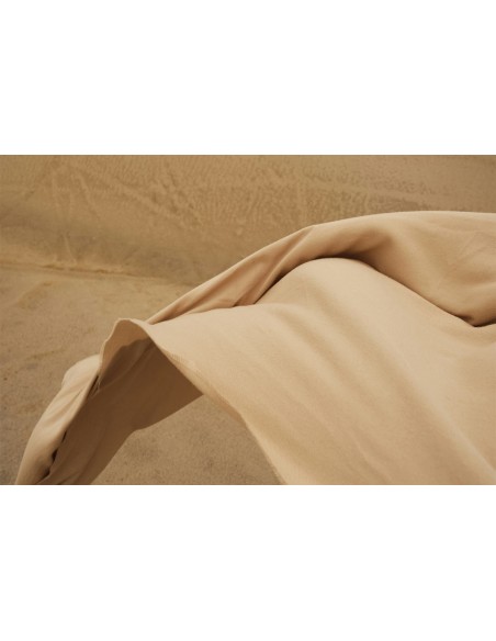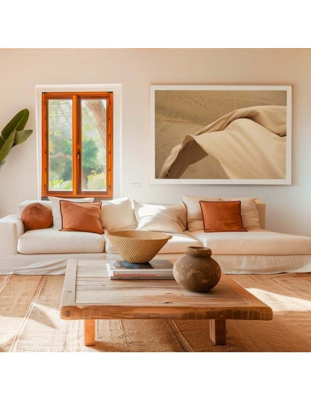 Esta fotografía capta el instante en que una tela beige se eleva suavemente en medio del paisaje árido, mimetizándose con los tonos cálidos y terrosos del entorno. La imagen transmite ligereza, naturalidad y una estética minimalista que evoca calma y libertad.
