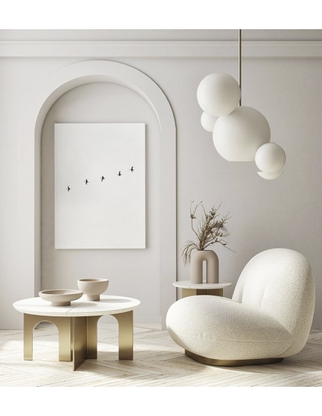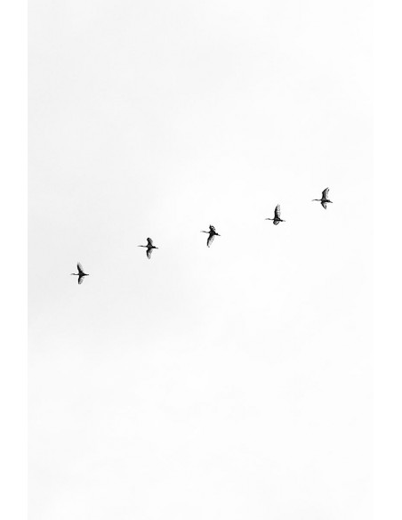 Hilera de grullas en vuelo formando una línea sobre fondo blanco. Un cuadro lleno de paz y serenidad que te atrapa y te hipnotiza
