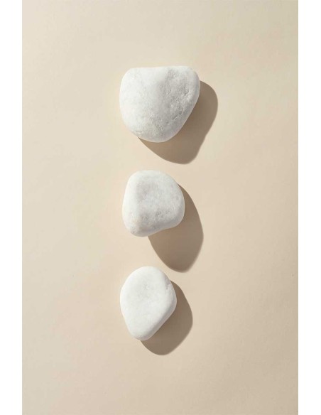 Fotografía homenaje a la belleza simple y serena con esta imagen de una serie de piedras blancas sobre fondo beige.