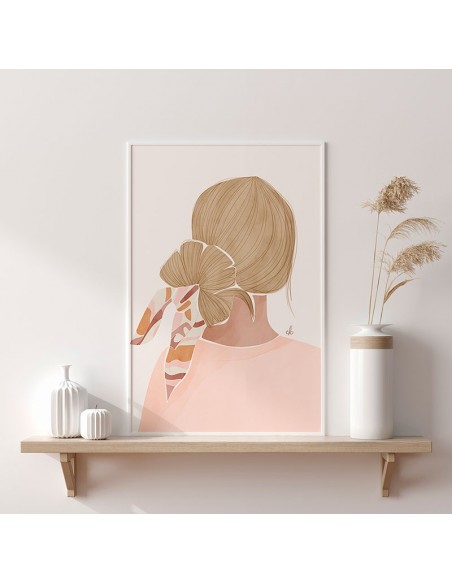 Ilustración de una chica de espaldas, donde resaltan los detalles del pañuelo que lleva anudado. Un diseño original de la artista Chloé Lamothe.