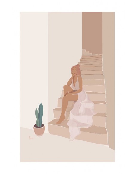 Una chica sentada en unas escaleras con un bonito vestido. Una ilustración en tonos naturales que te transportarán a las calles de un lugar de ensueño. Reproducción de la obra de Christine Kapa.