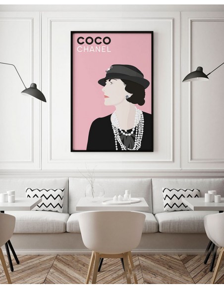 Una ilustración de la famosa diseñadora Coco Chanel, sobre un fondo rosa. Un retrato del artista Bruno Vázquez.