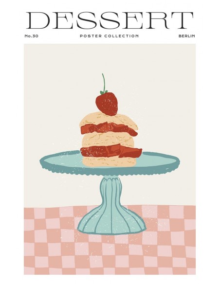 Ilustración de plato elevado con un rico postre. Un diseño fresco, colorista y de última moda para combinar con otros cuadros formando parejas o trios