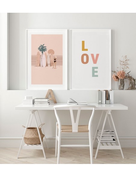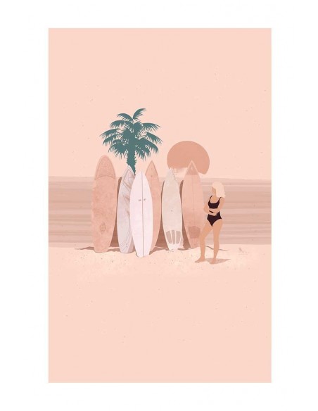 Una preciosa ilustración en tonos cálidos, representando a una chica con unas tablas de surf. Un diseño original de la artista Christine Kapa.