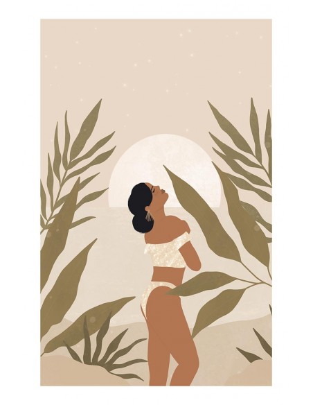 Ilustración de una chica disfrutando del sol en una playa paradisíaca. Una obra en tonos naturales de la artista Diana Mejia.