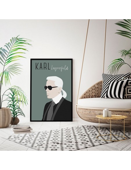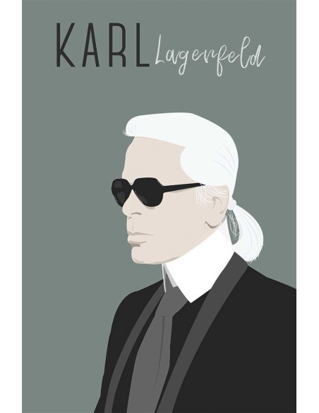 Una ilustración del diseñador Karl Lagerfeld, sobre un fondo verde. Un retrato del artista Bruno Vázquez.