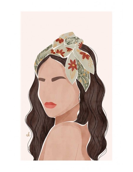 Ilustración de una chica con un pañuelo en la cabeza. Haz una combinación con varios cuadros de la Colección Ilustraciones para dar un toque diferente a tus espacios. Un diseño original de la artista Chloé Lamothe.