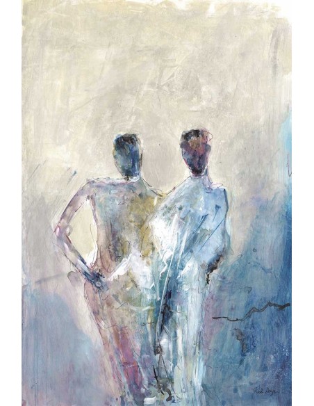 Una ilustración de dos figuras femeninas en tonos azules y marrones. Reproducción de la obra de Ruth Design.