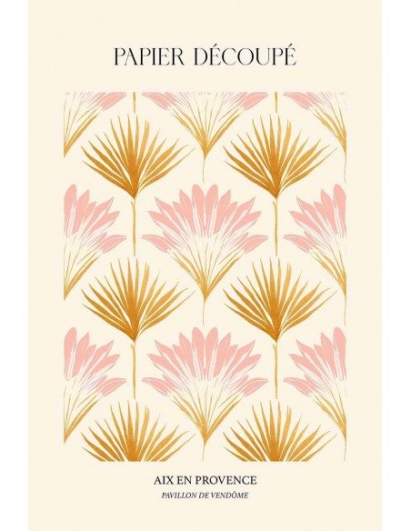 Diseño de un patrón simétrico de hojas de palma rosadas y doradas superpuestas. Con el fondo de color crema, el patrón adquir un estilo tropical con sus colores brillantes y formas atrevidas.