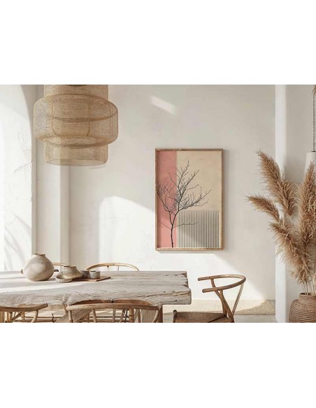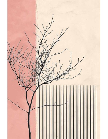 Árbol de ramas finas sobre un fondo de textura lisa y rayada. La ausencia de hojas aporta elegancia y estética minimalista a la composición.
