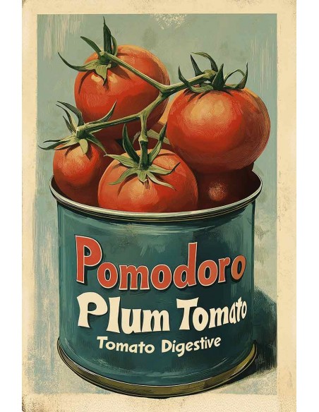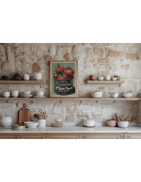 Ilustración de una lata de tomate con tomates naturales encima. Un toque especial para decorar cualquier cocina, combinadolo con otras ilustraciones de la misma colección. Disponible en varios tamaños y acabados.