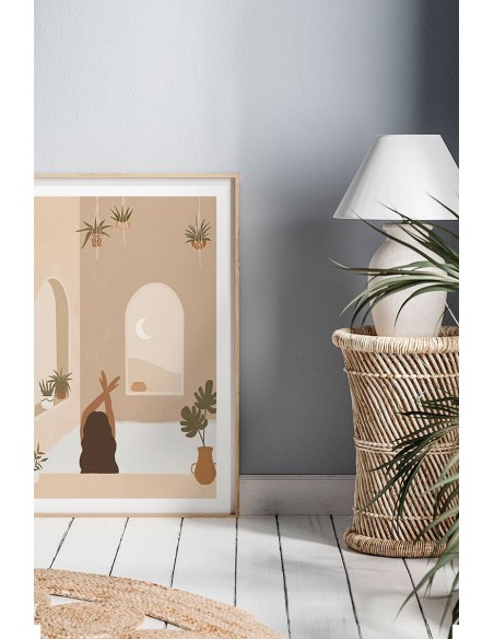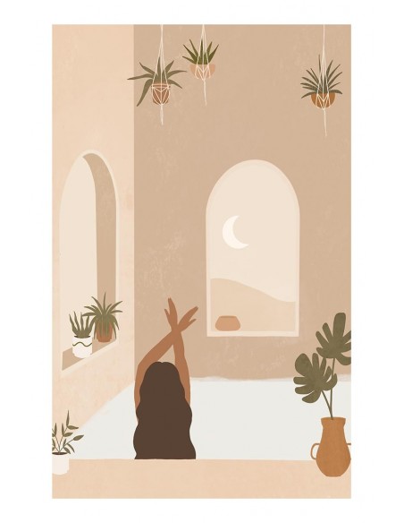 Ilustración en tonos naturales con una chica en un spa rodeada de plantas. Una obra de la artista Diana Mejia.