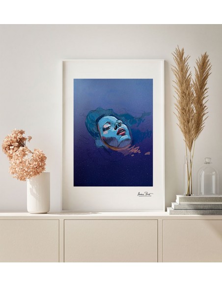 ¿Te gustan las ilustraciones originales? Este retrato en tonos azules te enamorará. Una reproducción de la obra de Aurora Rumi.