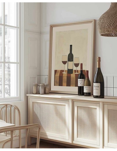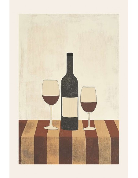 Abstracto de bodegón de botella de vino con dos copas. Bodegón campestre. Combinable con más diseños de la misma colección para decorar cocinas. Disponible en varios tamaños y acabados.