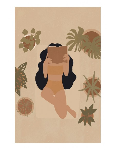 Una ilustración de una chica tumbada al sol leyendo un libro y rodeada de plantas. Una obra de la artista Diana Mejia.