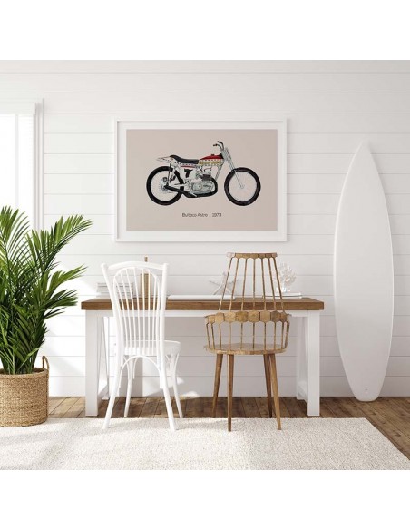 Art Poster estilo retro de la motocicleta "Bultaco Astro". Una ilustración del artista César Ortiz Echagüe disponible en varios tamaños y acabados. Ideal para regalar a los amantes de las motos. Combinala con otros modelos de motocicletas disponibles.