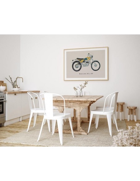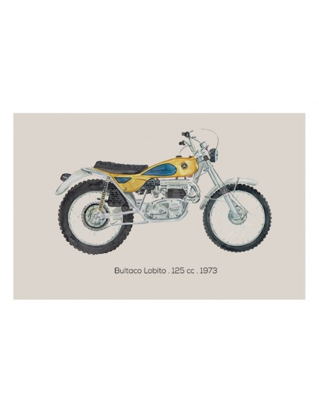 Art Poster estilo retro de la motocicleta "Bultaco Lobito". Una ilustración del artista César Ortiz Echagüe disponible en varios tamaños y acabados. Ideal para regalar a los amantes de las motos. Combinala con otros modelos de motocicletas disponibles.