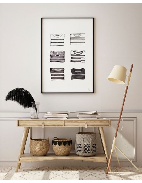 Conjunto de seis camisetas de rayas negras dobladas.Composición diseñada por Valenria Rienzi. Combina este cuadro con otros para formar un collage
