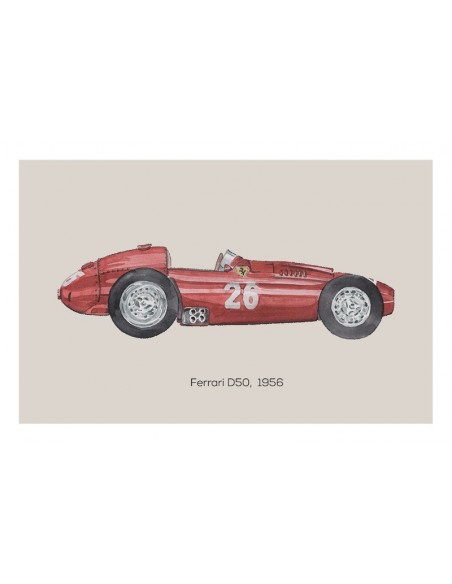 Ilustración de César Ortiz Echagüe del coche de Ferrari D50 de 1956 para los nostálgiicos de la competición. Un modelo disponible en varios tamaños y acabados.