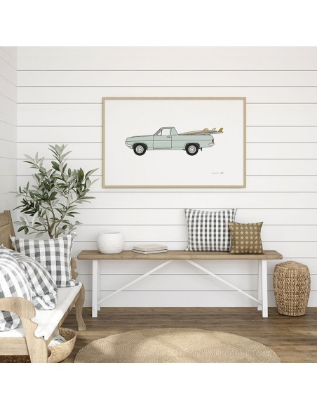 Una ilustración para los amantes de los viajes y del surf. Un coche estilo retro cargado con tablas de surf. Una reproducción de la obra de Matthew Wigglesworth.