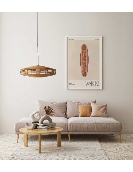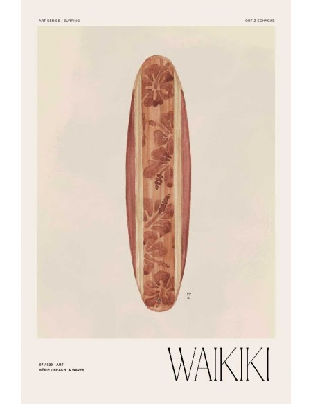 Ilustración de taba de surf en tonos naranjas, al más puro estilo retro. Otros modelos y colores disponibles. Reproducción del dibujo de César Ortiz Echagüe