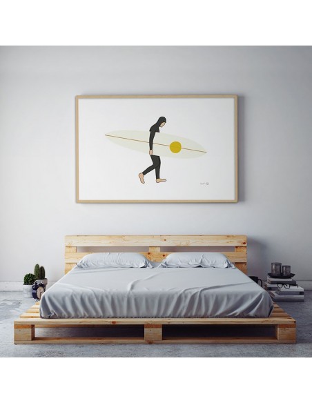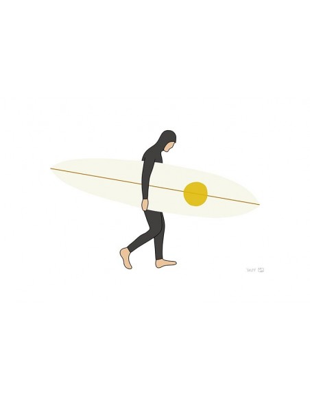 Un surfero con su neopreno y su tabla listo para entrar al agua. Una reproducción de la obra de Matthew Wigglesworth.