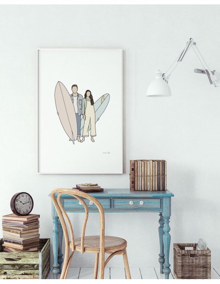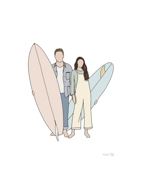 Un retrato de una pareja joven con sus tablas de surf. Con un estilo juvenil y alegre esta obra es ideal para hacer una combinación de varios cuadros. Una reproducción de la obra de Matthew Wigglesworth.