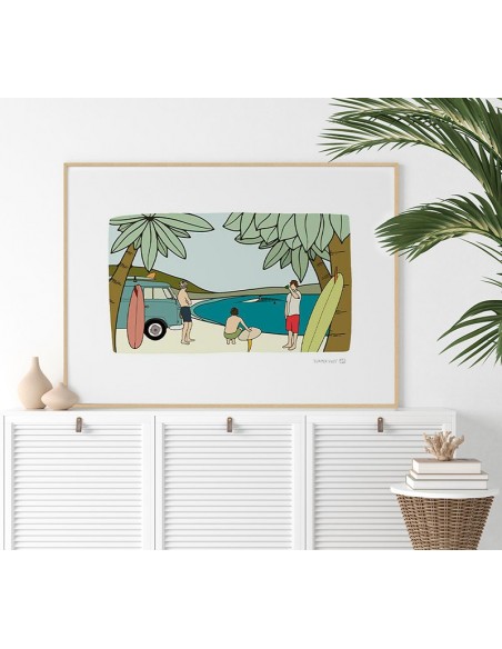 Si te gusta el sol, la arena y el mar te encantarán nuestros cuadros de Temática Surf. Esta ilustración captura a un grupo de amigos tomándose un descanso. Una reproducción de la obra de Matthew Wigglesworth.