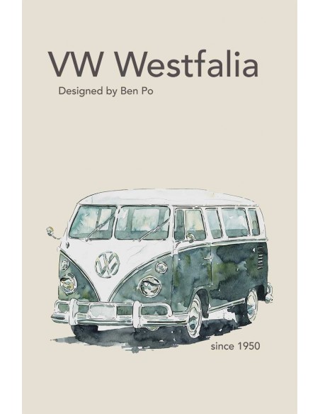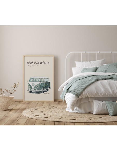 Poster de la mítica furgoneta "Westfalia" del 1950 para los más hipies. Un diseño reinterpretado por el artista César Ortiz Echagüe. Ideal decorar espacios como habitaciones juveniles, cuartos de juego, despachos y salas de estar. Elige tu tamaño.