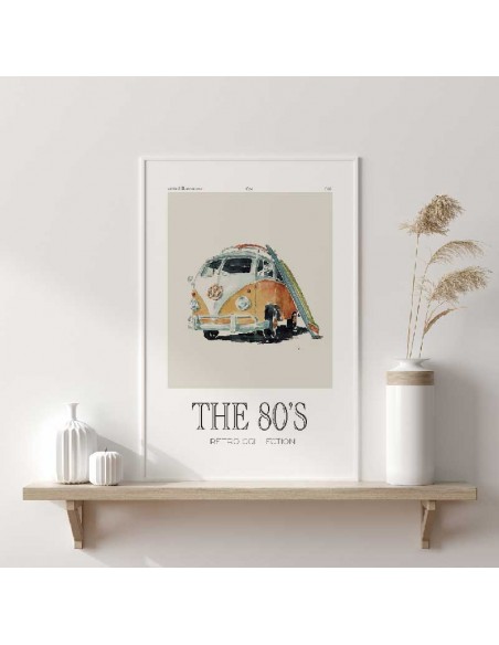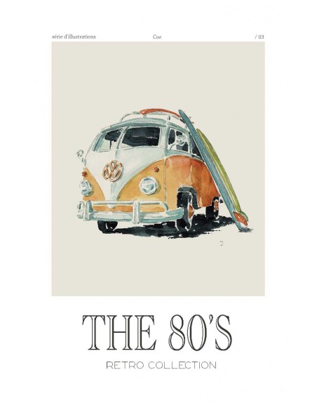 Ilustración de furgoneta Westafalia con tablas de surf. Reproducción del dibujo de César Ortiz Echagüe