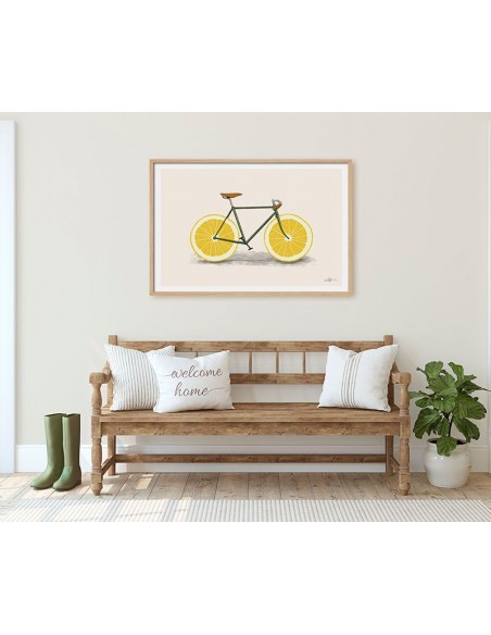 Original imagen de bicicleta con limones como ruedas, reproducción del diseño de Florent Bodart. Ideal para formar un collage