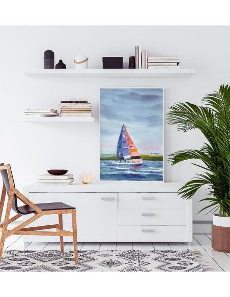 Imagen de velero de velas azul y naranja en alta mar. Otros veleros disponibles. Diseño de Ruth Design .