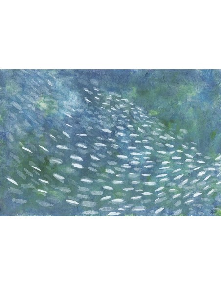 Paisaje marino turquesa con banco de peces blancos reproducción del diseño original de Marta Castet Bellocq