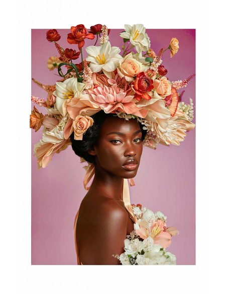Impresionante fotografía con mucha fuerza cromática. Retrato de mujer vestida con flores y con un tocado surrealista con un bouquet de flores coloridas. Ideal para combinar con diseños de la misma colección. Disponible en varios tamaños y acabados.
