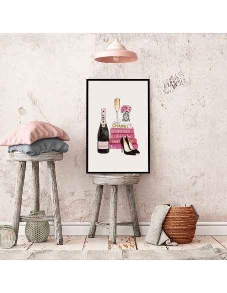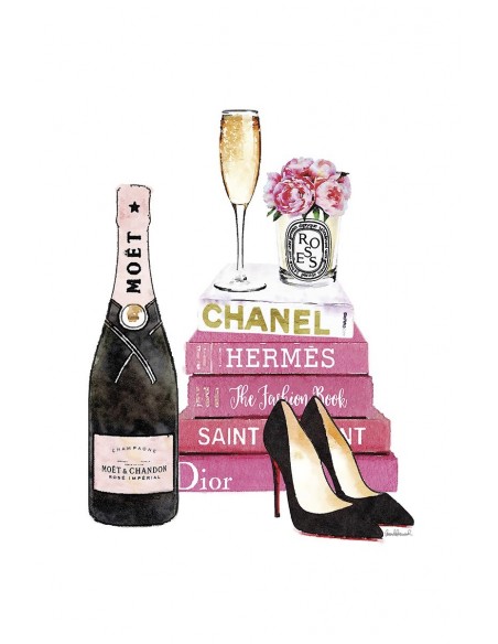 Ilustración de libros de moda junto a una botella de champán. Diseño de Amanda Greenwood.