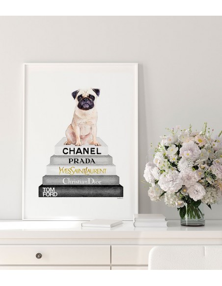 Ilustración de libros de moda con un perrito. Diseño de Amanda Greenwood.