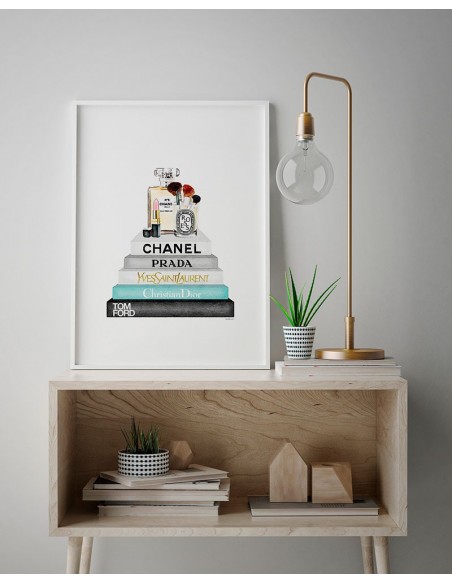 Ilustración de libros de moda con perfume y maquillaje. Diseño de Amanda Greenwood.