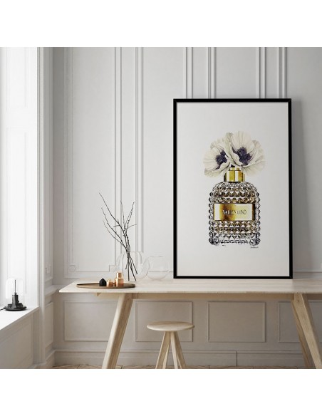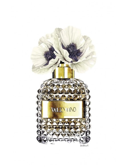 Ilustración del frasco de perfume Valentino con flores. Diseño de Amanda Greenwood.