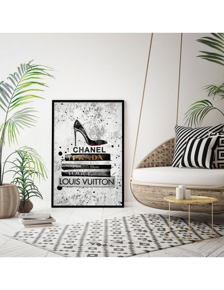 Dibujo de unos zapatos sobre libros de moda. Ideal para combinar dos o más cuadros de la misma colección. Obra de Amanda Greenwood.