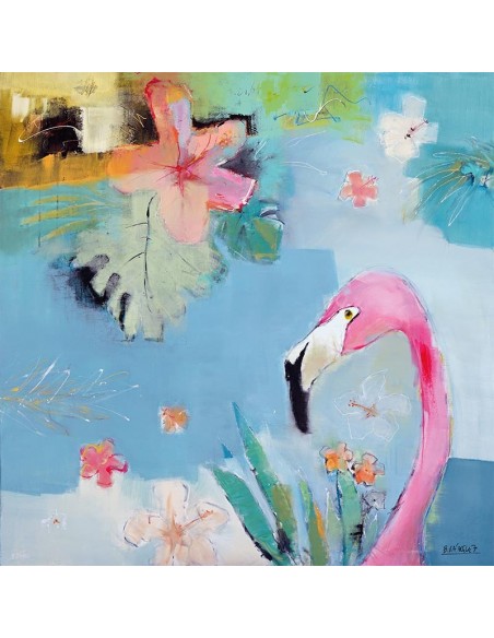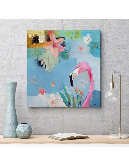 Cuadro de flores y flamencos en color rosa. Artista: Bruno Vázquez