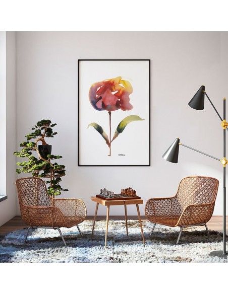 Flor roja en primer plano sobre fondo blanco. Reproducción del diseño de Bruno Vázquez