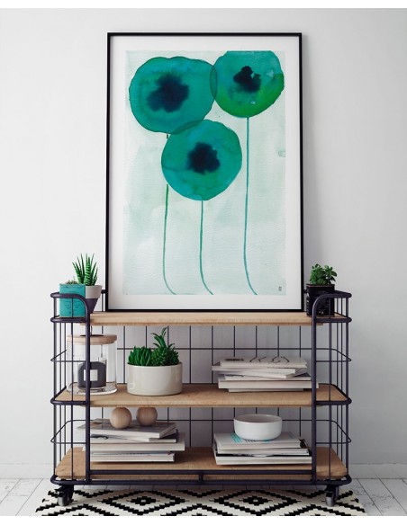 Conjunto de tres flores abstractas en turquesa. Reproducción de César Ortiz Echagüe