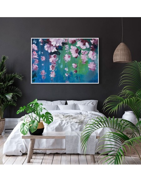 Flores colgantes en varios colores sobre fondo azul. Artista: Luisa Romero