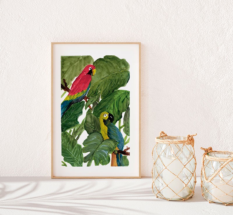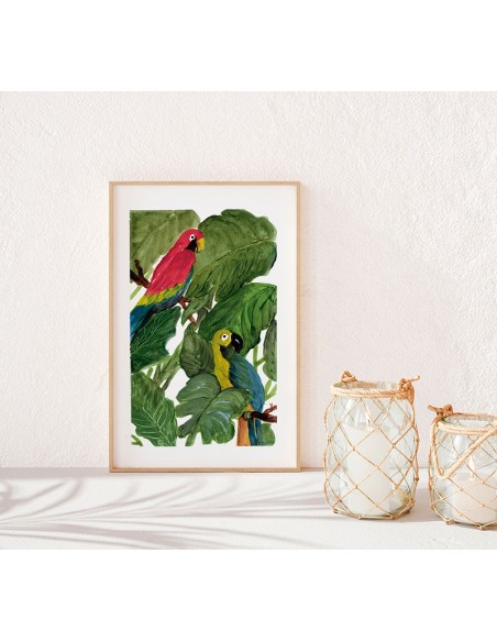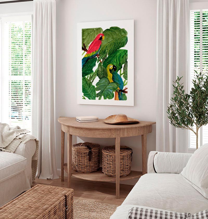 Obras Karioca III LR165 Desde 7,67 € 10,95 € Cuadro estilo tropical con grandes hojas verdes y dos tucanes azules. Diseño original realizado por Luisa Romero Ver