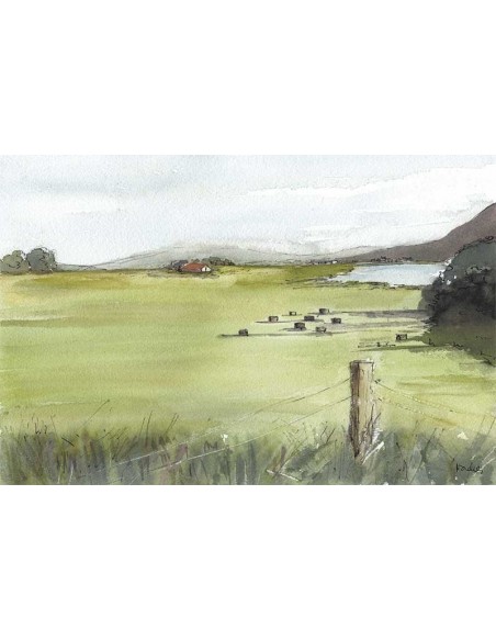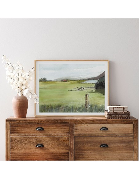 Paisaje de campo en el atardecer. Reproducción de la Obra de Nacha Cassinello