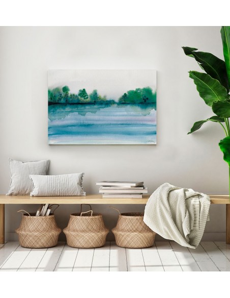 Bosque verde reflejado sobre las aguas azules. Reproducción de la Obra de Marta Castet Bellocq