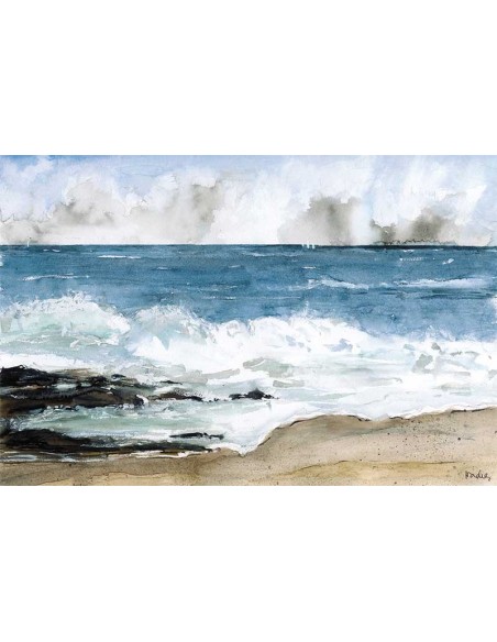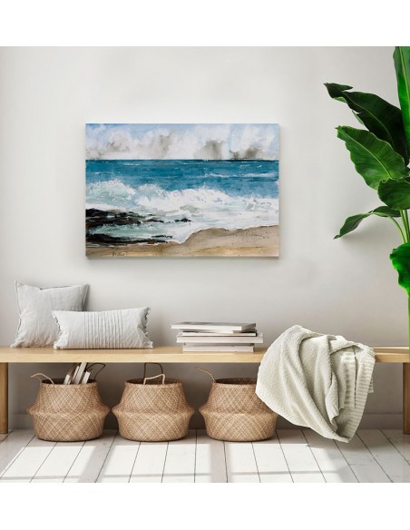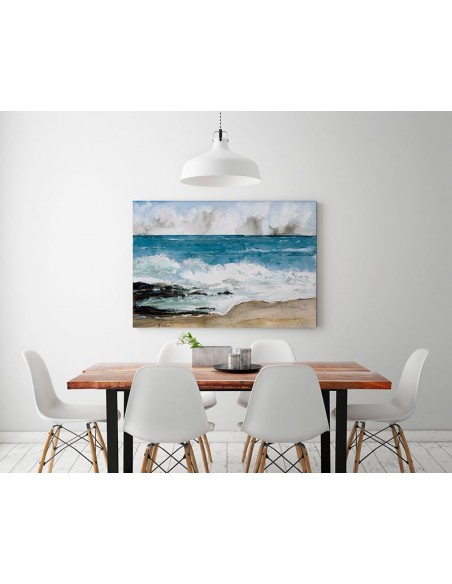 Paisaje del mar con olas de espuma blanca al pie, reproducción de Nacha Cassinello.
