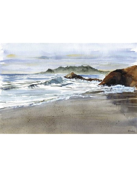 Paisaje de playa con las olas golpeando en la roca, reproducción de Nacha Cassinello.