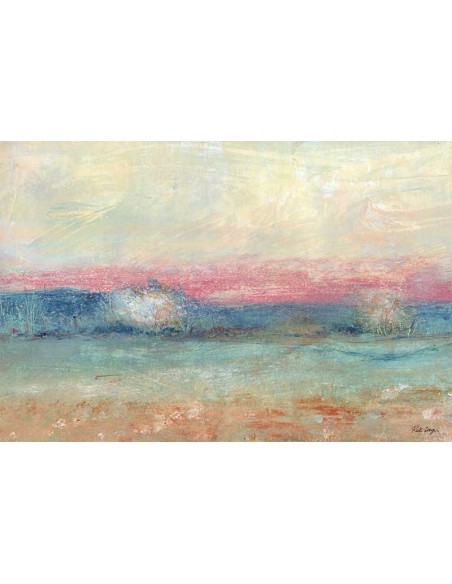 Idílico paisaje de campo en tono coral. Reproducción de la obra de Ruth Design